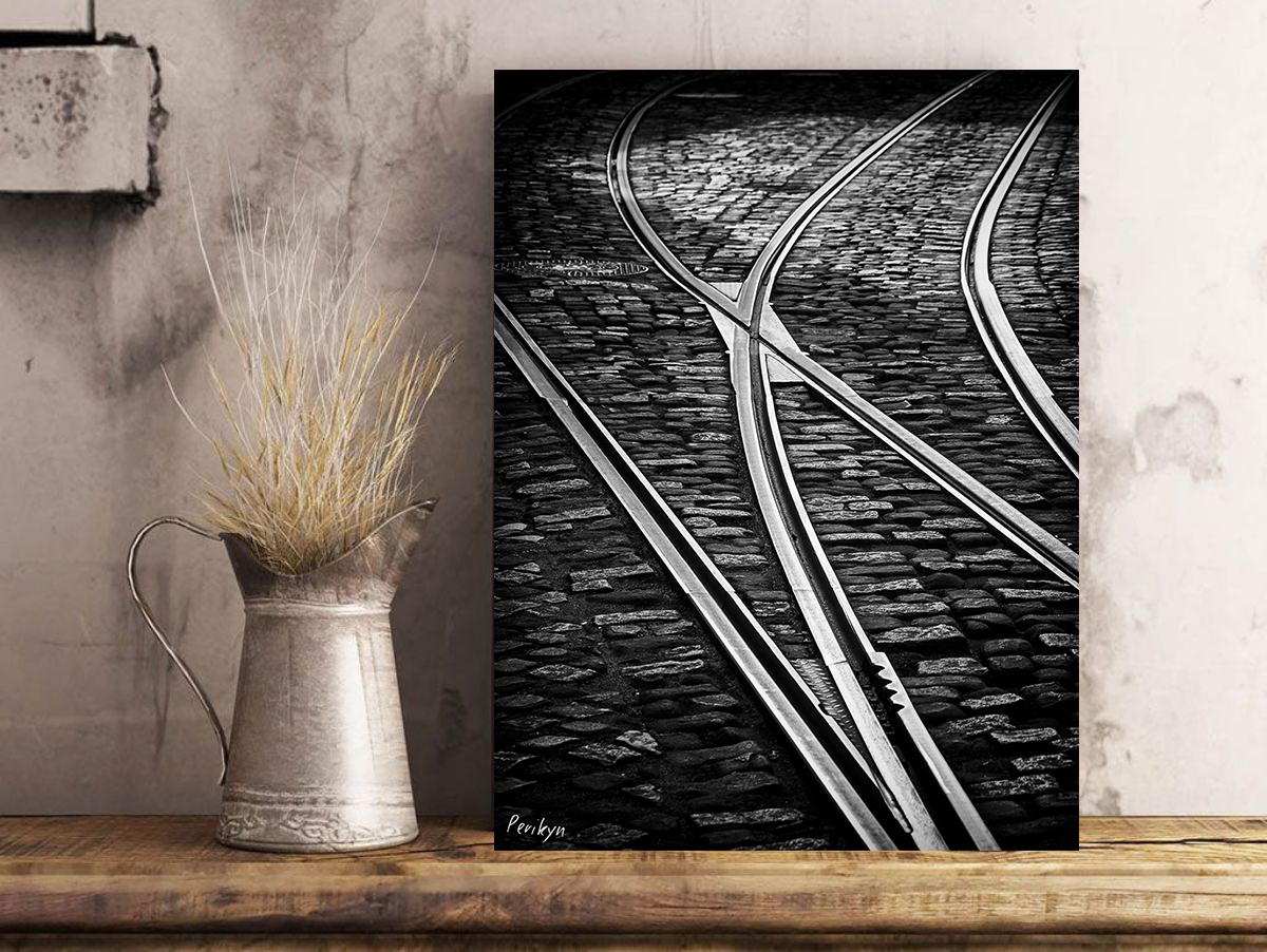 This photograph was taken in Lisbon and captures a piece of street with rails where Lisbon trams pass; it is a metaphorical, minimalist image, but without saying anything, it expresses a lot.